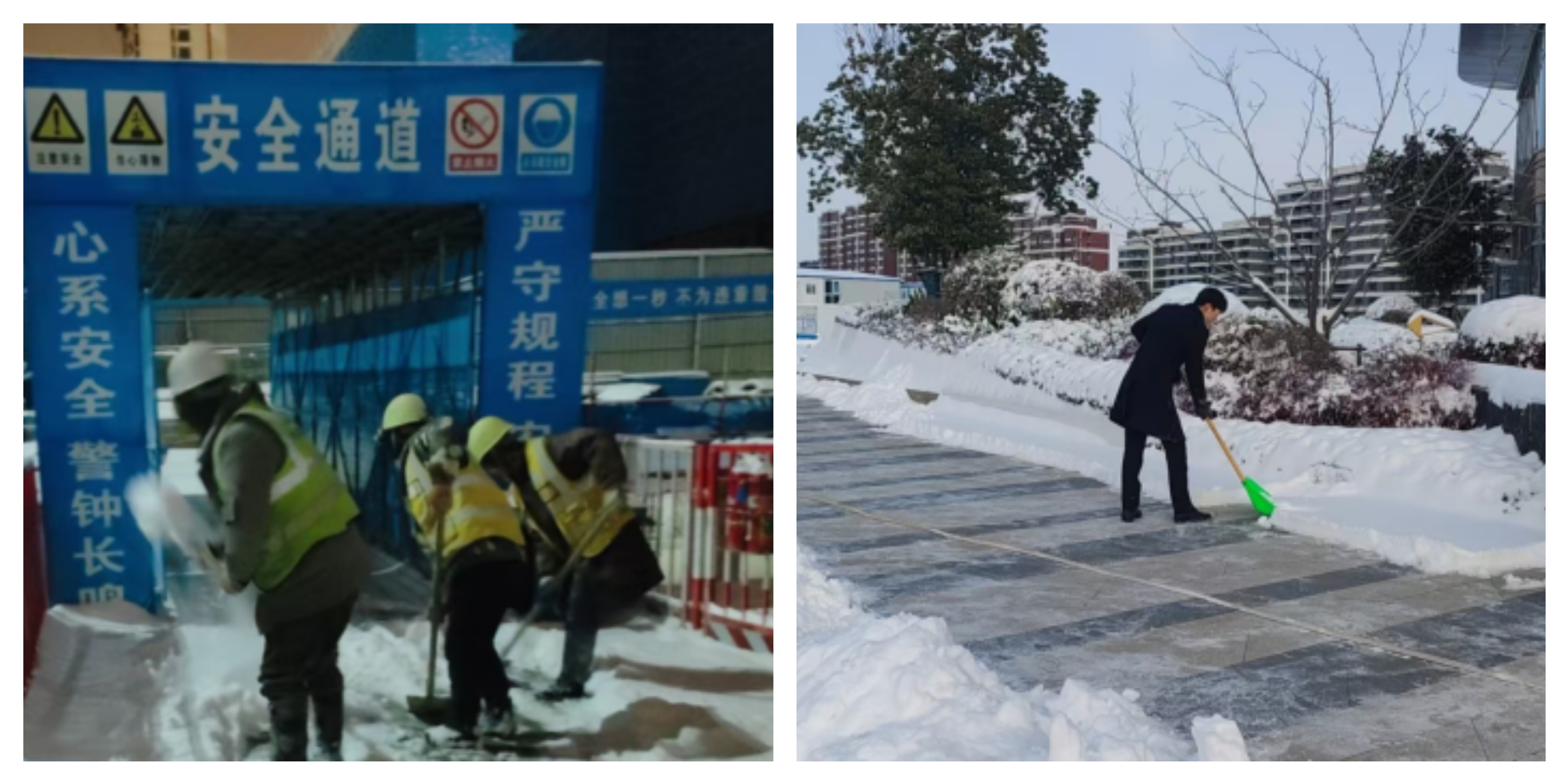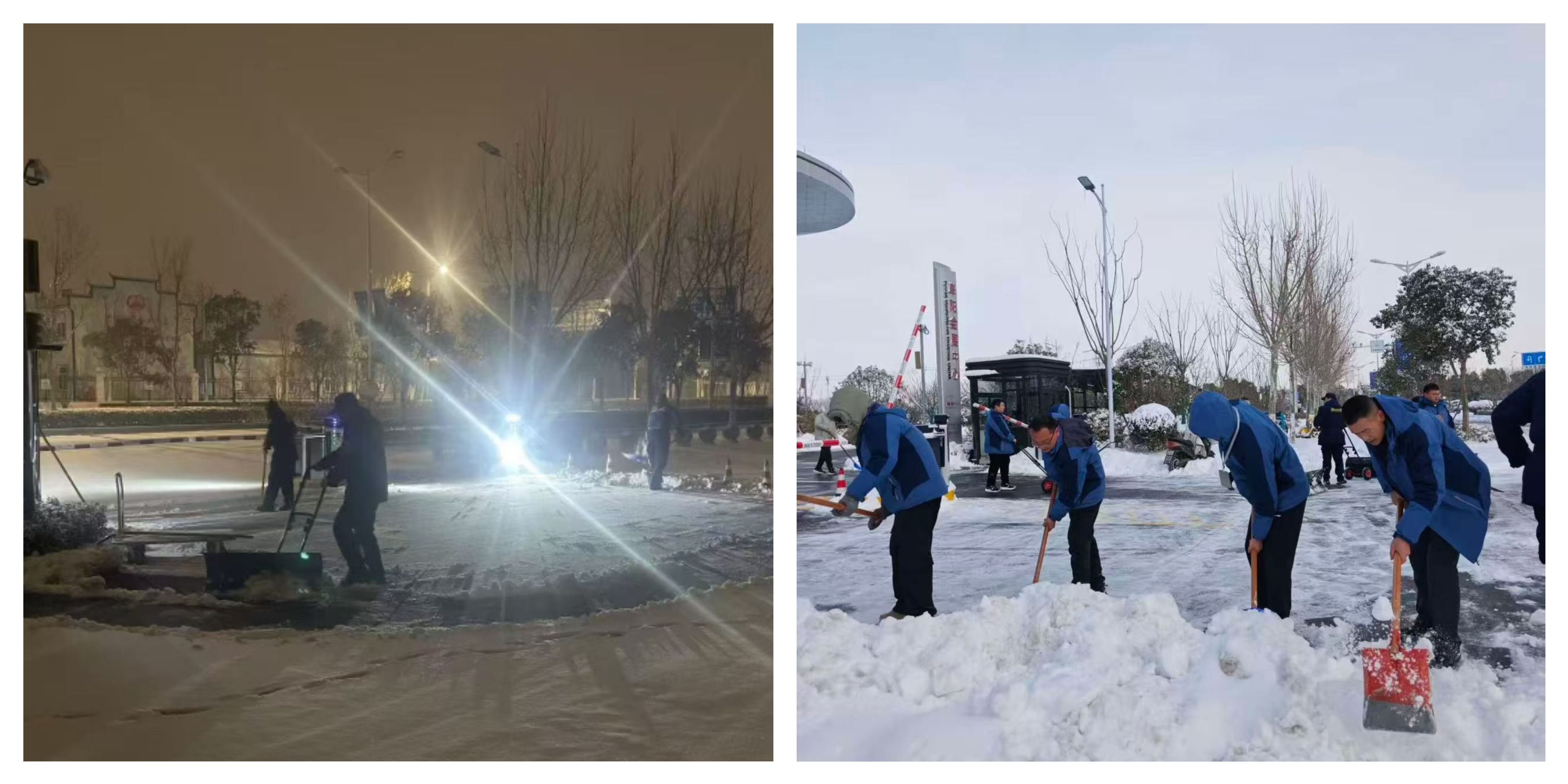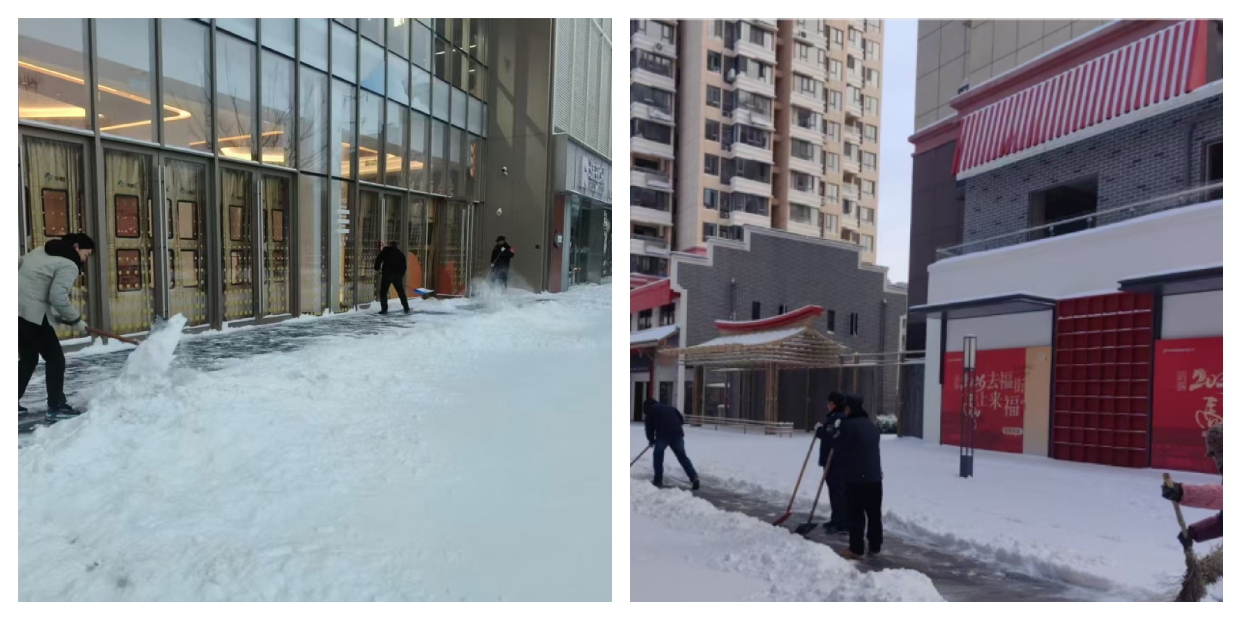 1月19晚降雪逐漸增大,各項目、鄰里匯商業(yè)、售樓部、會展中心分別組織專人在主干道、通道出入口清理積雪,潑灑工業(yè)鹽、融雪劑,對設(shè)備設(shè)施進(jìn)行檢查,并設(shè)置24小時值班電話,應(yīng)對突發(fā)情況。